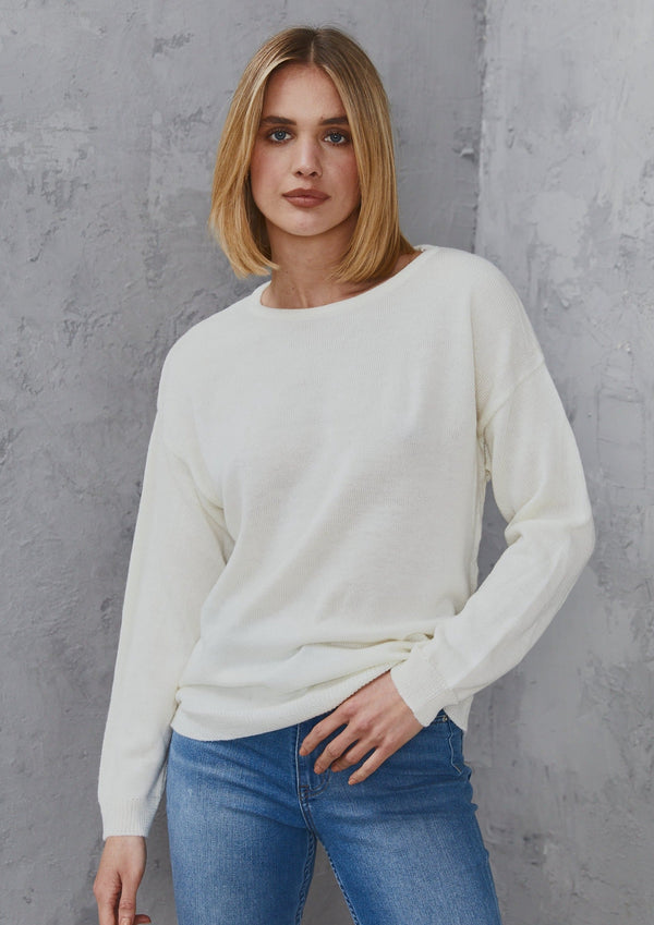 Super soft mid-weight cotton/cashmere blend knit.  Relaxed fit, semi-wide crew neckline
