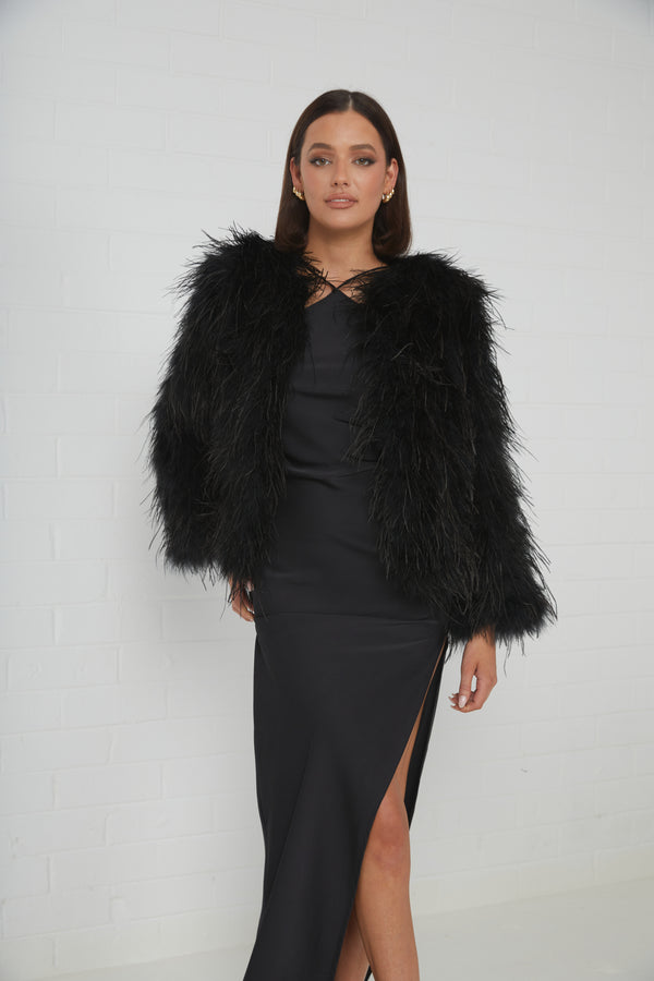 This magnificent jackets will be your forever piece to fall in love with. Handcrafted and covered with luxe feathers that will fly with each step. Accommodate your individual style and make maximum impact with minimal effort in our Mia Ostrich Feather Jacket.